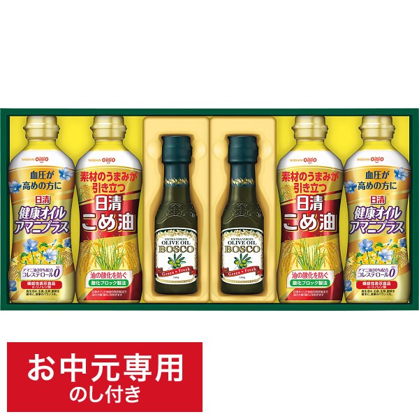 ●商品内容:ボスコエキストラバージンオリーブオイル140g×2、こめ油350g×2、日清健康オイルアマニプラス350g×2