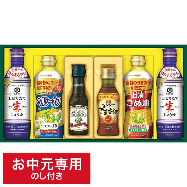お中元 油 送料無料 日清 ヘルシーオイル&キッコーマン生しょうゆギフト NK-30 / LTDU 油ギフト オイルギフト 油セット 調味料セット 調味料ギフト NISSHIN Oillio 2025 夏ギフト 御中元専用 贈答品 贈り物 詰合せ 詰め合わせ セット JGS