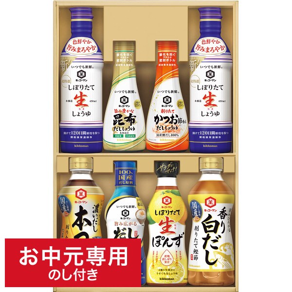 ●商品内容:しぼりたて生しょうゆ450ml×2、削りたてかつお節香るだししょうゆ200ml×1、旨み豊かな昆布だししょうゆ200ml×1、旨み広がるだししょうゆ330ml×1、濃いだし本つゆ500ml×1、旨みひろがる香り白だし500ml×1、しぼりたて生ぽんず360ml×1