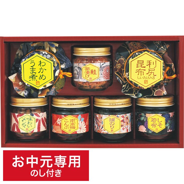 ●商品内容:わかめうま煮100g・鮭茶漬け65g・利尻昆布しいたけ入り80g・味わいメンマ75g・南高梅こんぶ100g・摘のり125g・しそ若布95g×各1