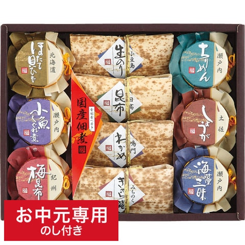 ●商品内容:小豆島生のり100g・日高昆布100g・鳴門わかめ100g・みちのくきゃら蕗100g・北海道ほたて貝ひも60g・瀬戸内ちりめん45g・瀬戸内小魚しぐれ煮(小魚:瀬戸内産)40g・土佐しょうが45g・紀州梅昆布(梅:紀州産)80g・瀬戸内海藻三昧90g×各1