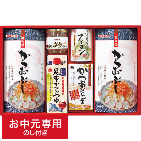 当社独自製法のかつお削りぶしパック、かつお節本来の香り豊かなだしの素、国産野菜6種の自家抽出だしを使ったブイヨン、かつお節と昆布の絶妙なバランスつゆなど、バラエティ豊富な調味料詰合せギフトです。