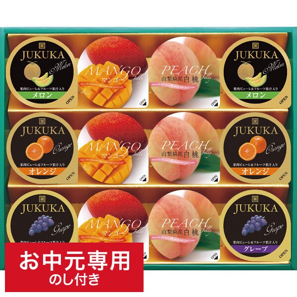 ●商品内容:マンゴーゼリー・山梨県産白桃ゼリー各52g×各3、メロンゼリー・オレンジゼリー・グレープゼリー各52g×各2