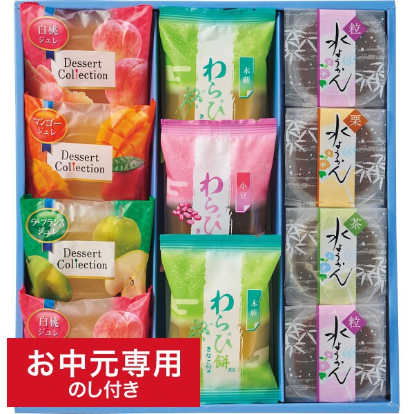 ●商品内容:水ようかん78g×4(粒×2、栗・抹茶×各1)、わらび餅81g×3(本蕨×2、小豆×1)、ジュレ65g×4(白桃×2、マンゴー・ラフランス×各1)