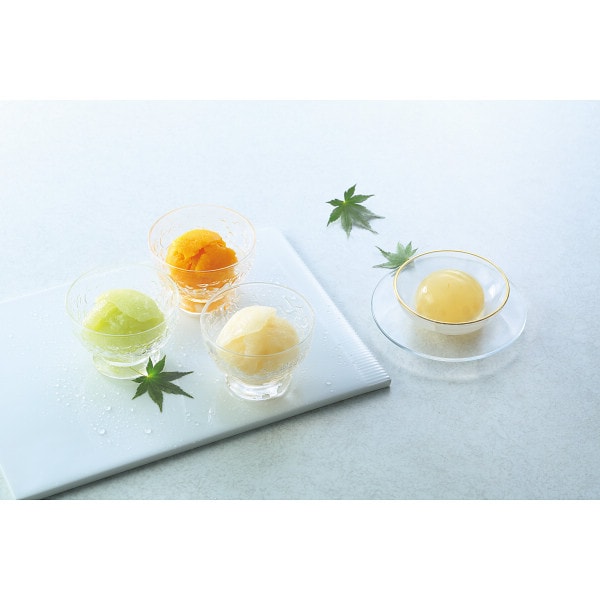 マスカット・白桃・マンゴー。彩りあざやかな果実のしずくがお口の中でひんやりとろける涼の美味しさ。冷やしてぜりぃ、凍らせてしゃーべっととして、二通りの味わいをお楽しみいただけます。