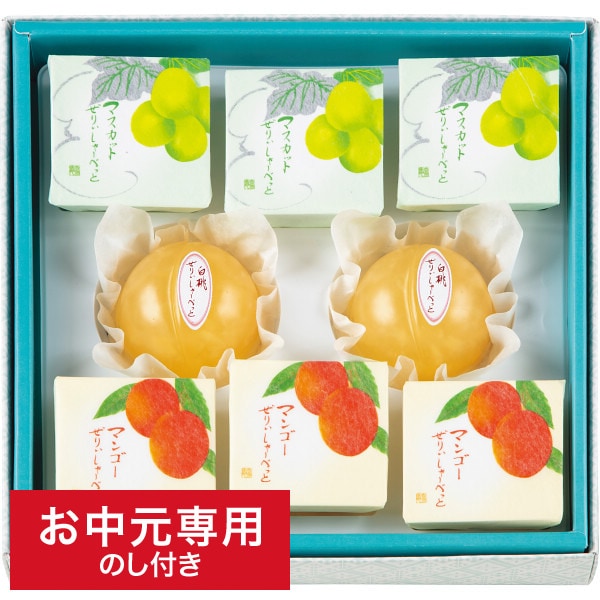 ●商品内容:マスカットぜりぃしゃーべっと・マンゴーぜりぃしゃーべっと各72g×各3、白桃ぜりぃしゃーべっと78g×2