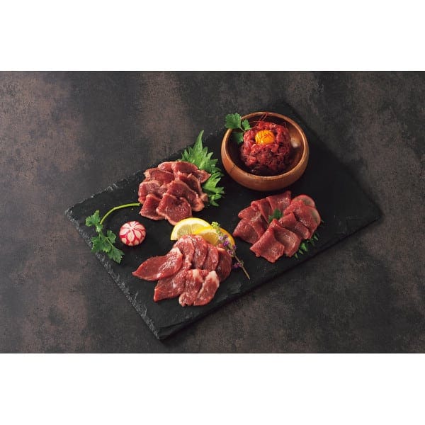●商品内容:ふじ馬刺したたき・ロース・上赤身各80g、ふじ馬刺しユッケ50g×2(馬刺し:カナダ産又はフランス産又は国産(熊本肥育))、馬刺しのたれ5ml・生姜小袋3g×各4、ユッケのたれ10g×2、たたきのたれ20g