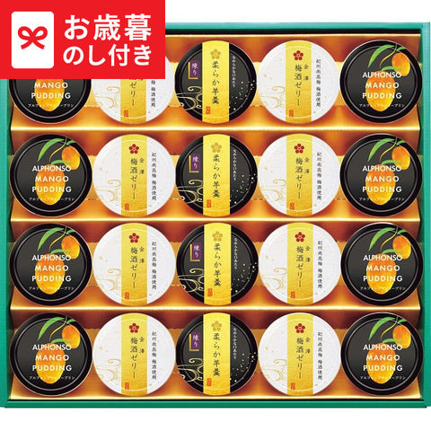 濃厚な味わいのアルフォンソマンゴープリンと、なめらかな口あたりの柔らか羊羹、紀州南高梅梅酒で作った金澤梅酒ゼリーの詰合せ。