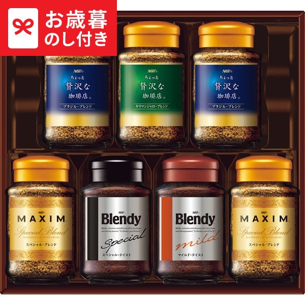 まずはストレートで楽しみたい「ちょっと贅沢な珈琲店」「マキシム」と、ミルクをたっぷり入れて深いコクのカフェオレが楽しめる「ブレンディ」インスタントコーヒーの詰め合わせです。気分に合わせて色々な飲み方を楽しめるギフトセットです。