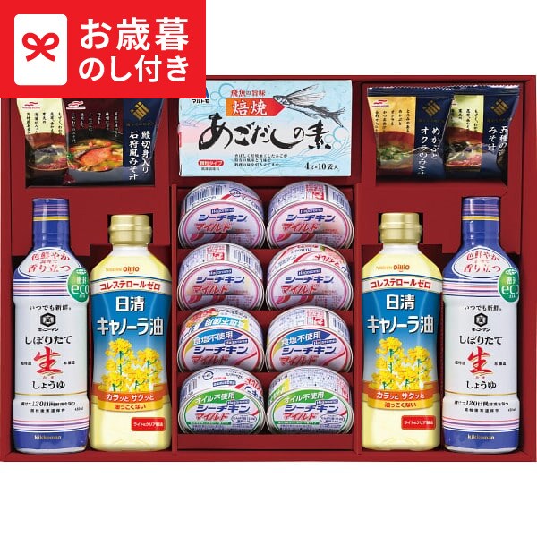 ●商品内容:はごろもフーズオイル不使用シーチキンマイルド70g×2、はごろもフーズ食塩不使用シーチキンマイルド70g×2、はごろもフーズシーチキンマイルド70g×4、日清キャノーラ油350g×2、キッコーマンいつでも新鮮しぼりたて生しょうゆ450ml×2、マルハニチロ海からのめぐみ五種の海藻みそ汁(フリーズドライ)×2、マルハニチロ海からのめぐみめかぶとオクラのみそ汁(フリーズドライ)、マルハニチロ鮭切身入り石狩風みそ汁(フリーズドライ)、マルトモあごだしの素(4g×10)