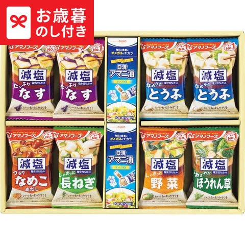 ●商品内容:日清アマニ油50g×2、減塩いつものおみそ汁(なす・とうふ)×各4、減塩いつものおみそ汁(ほうれん草・野菜・なめこ(赤だし)・長ねぎ)×各2(フリーズドライ・計16食)(2段重ね)