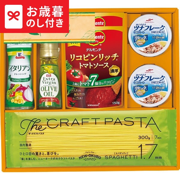 ●商品内容:日清エキストラバージンオリーブ油50g、MCイタリアンドレッシング150ml、マルハニチロ油そのままライトツナリセッタ70g×2、ザ・クラフトパスタ ブロンズスパゲッティ1.7mm(300g)、リコピンリッチトマトソース150g×2