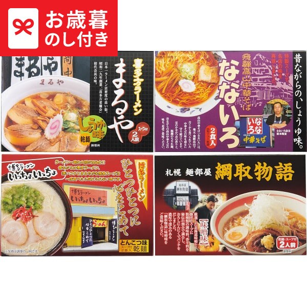 ●商品内容:札幌綱取物語味噌(麺80g・スープ64g)、喜多方まるや醤油(麺80g・スープ30g)、飛騨高山なないろ醤油(麺80g・スープ45g)、博多いっちょいっちょ豚骨(麺80g・スープ35g)×各2(全て乾麺)