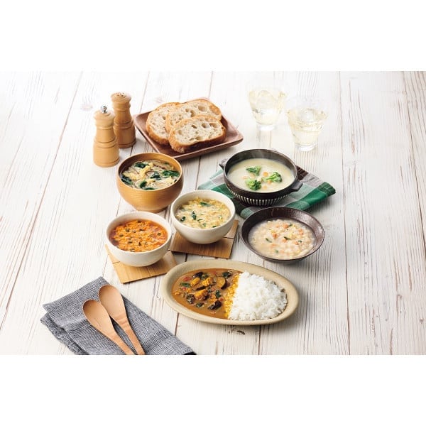 ●商品内容:Theうまみ 特製たまごスープ×4、Theうまみ 旨辛チゲスープ・Theうまみスパイスカレースープ×各2、にゅうめん すまし柚子・ほぐし身入り さけ雑炊・炙り たらこ雑炊・彩り野菜のクリームシチュー・野菜と鶏肉のカレー・ひきわり豆のトマトカレー×各1(計14食)(フリーズドライ)