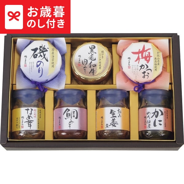 ●商品内容:磯のり90g・黒毛和牛肉みそ90g・梅かつお90g・柚子風味なめ茸85g・鯛みそ100g・刻み生姜煮90g・かにのり佃煮90g×各1