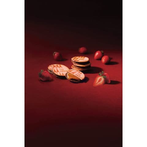 あまおう苺のフリーズドライを混ぜた濃厚なラングドシャ生地でキャラメルとチョコレートをサンドしました。