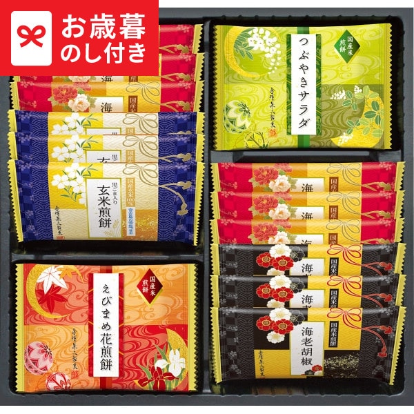 国産米100%の煎餅の詰合せです。加賀友禅をモチーフに色鮮やかにデザインされた目で見てきれいな米菓ギフトです。