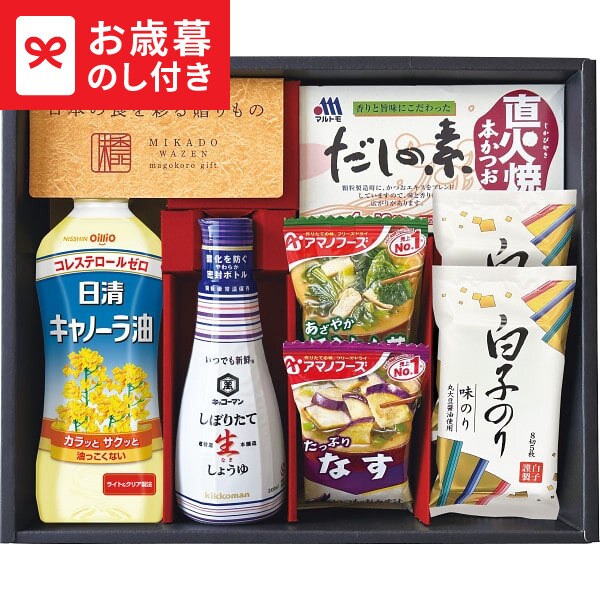 ●商品内容:キッコーマンしぼりたて生しょうゆ200ml、アマノフーズフリーズドライいつものおみそ汁(なす・ほうれん草)×各1、白子のり(8切5枚)×2、マルトモ直火焼だしの素(4g×10)、日清キャノーラ油350g