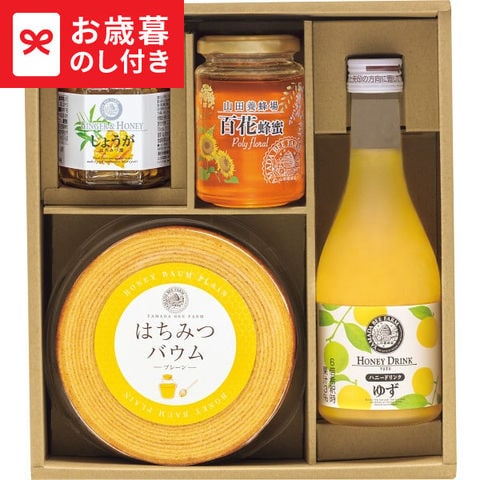 ●商品内容:はちみつバウム(直径約13cm)、百花蜂蜜200g、ゆずハニードリンク300ml、しょうがはちみつ漬120g