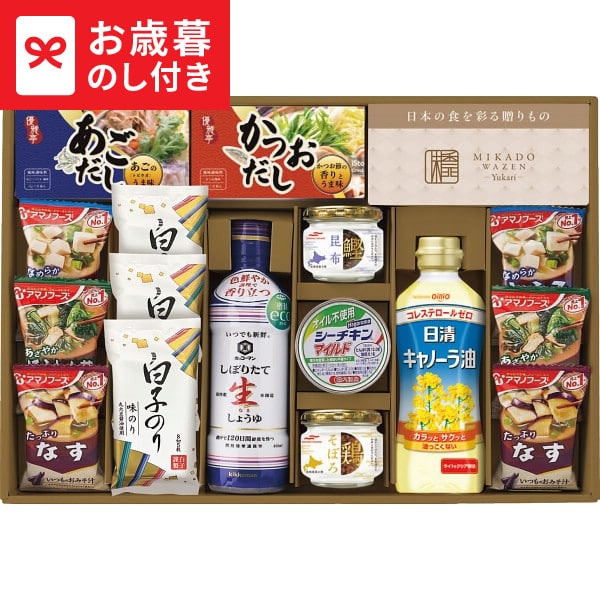 ●商品内容:キッコーマンいつでも新鮮しぼりたて生しょうゆ450ml、白子のり味のり(8切5枚)×3、マルハニチロ鰹昆布45g、マルハニチロ鶏そぼろ45g、日清キャノーラ油350g、オイル不使用シーチキンマイルド70g、メイワかつおだし(4g×6)、メイワあごだし(4g×6)、アマノフーズフリーズドライいつものおみそ汁(なす・とうふ・ほうれん草×各2)
