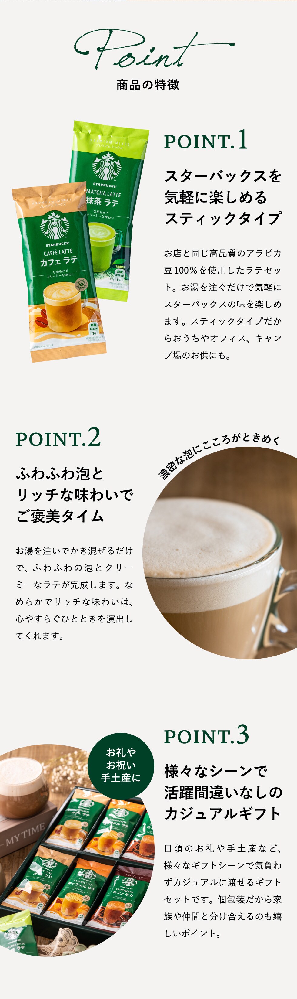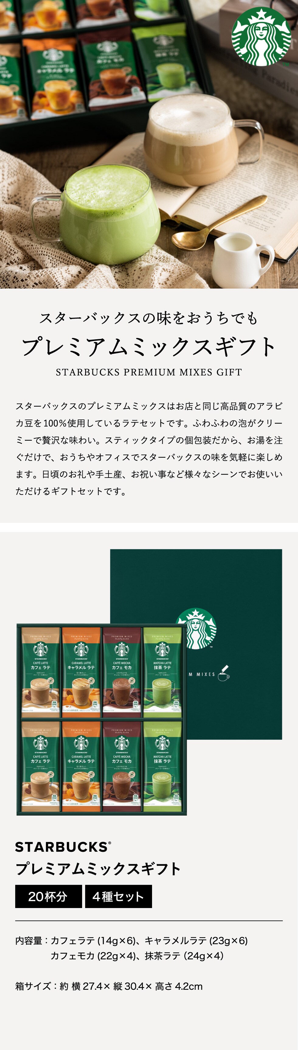 ●内容量:スターバックスプレミアムミックス(カフェラテ14g×6、キャラメルラテ23g×6、カフェモカ22g×4、抹茶ラテ24g×4)(スティック)