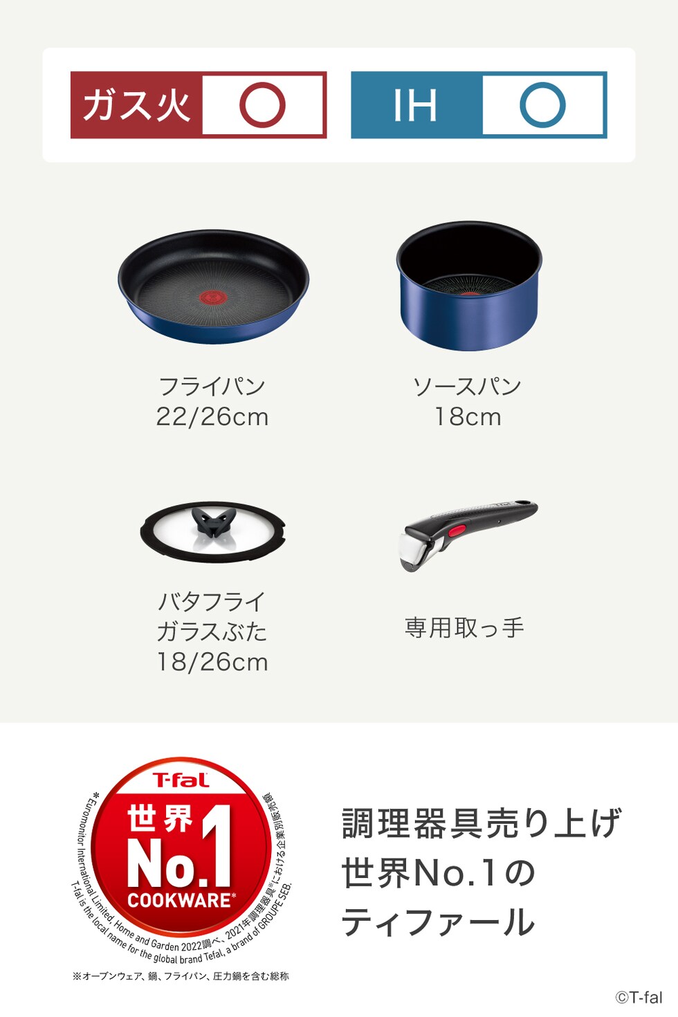 ●内容:フライパン 22/26cm、ソースパン 18cm、バタフライガラスぶた 18/26cm、専用取っ手 1本