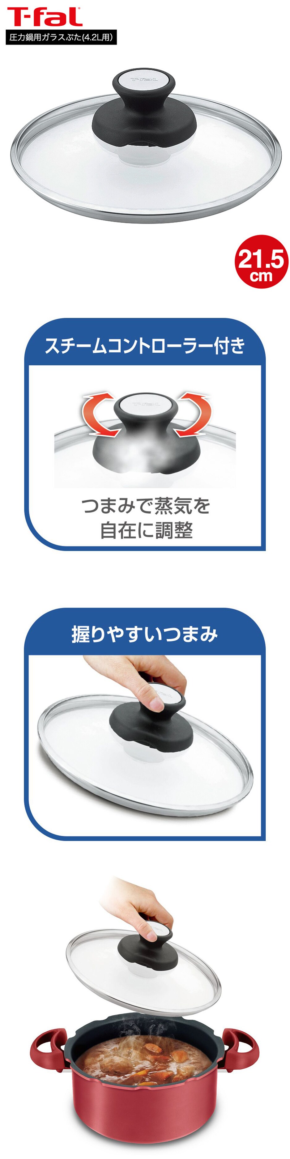 ティファール T-fal 圧力鍋用ガラスぶた 21.5cm (4.2L用)単品 X3070011 / 圧力鍋4.5L 6L ガラス蓋 ガラスふた フタ カバー クリプソ ミニット 温め直し 鍋 保管 煮込み t-fal T-FAL tfal Tfal
