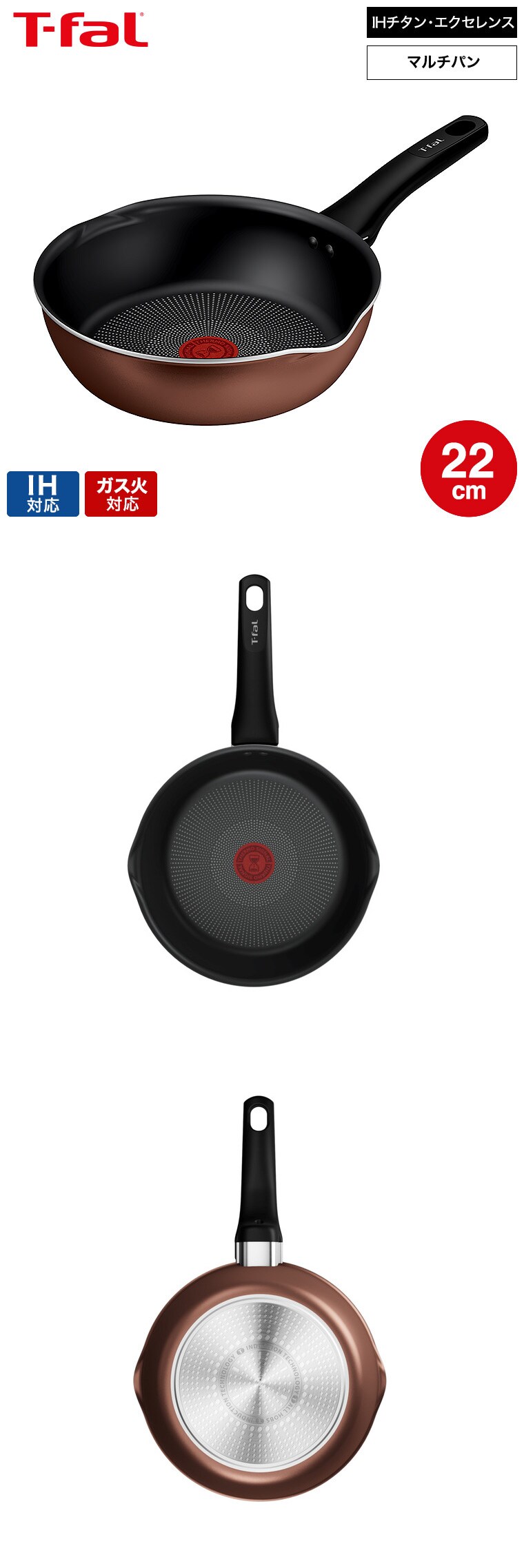 ティファール T-fal IHチタン・エクセレンス モカ マルチパン 22cm G17217 送料無料 / IH対応 ガス火対応 深型フライパン 中華鍋 調理 お知らせマーク こびりつきにくさ 長持ち 取っ手つきフライパン キッチンツール 調理器具 JGS