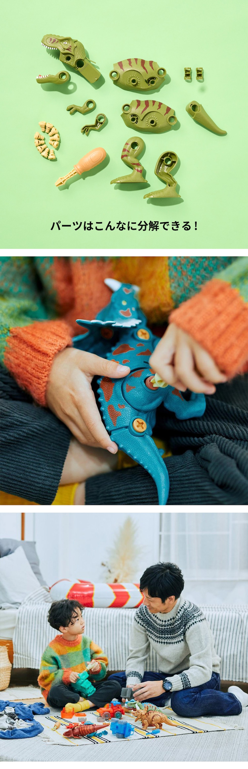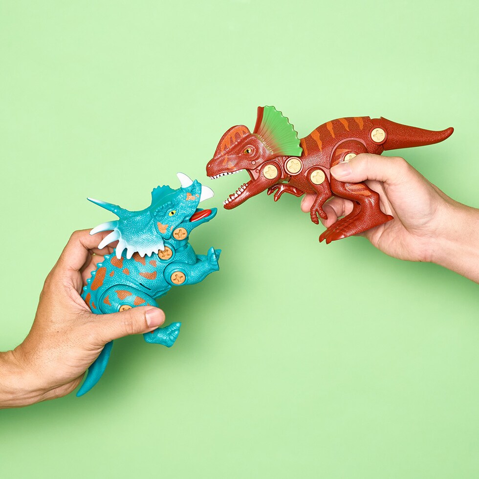 ドライバーで組み立てて遊ぶ恐竜のおもちゃ。