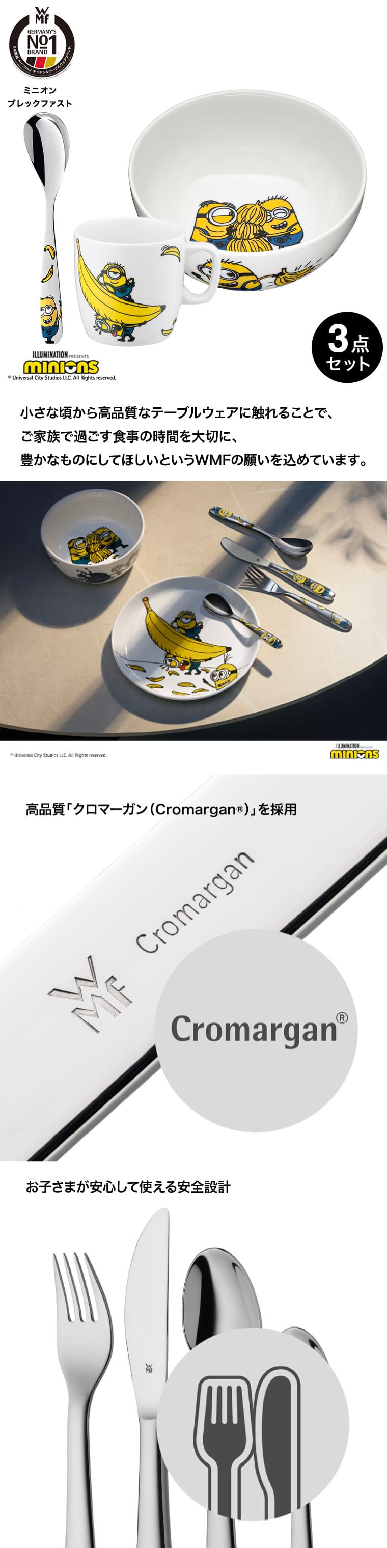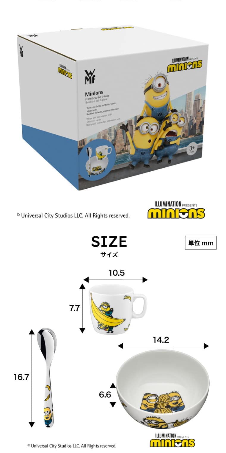 人気キャラクターであるミニオンの子供用スープ皿、マグカップ、スプーンのセット。WMFならではの高品質な素材を採用し、長く愛用いただけます。