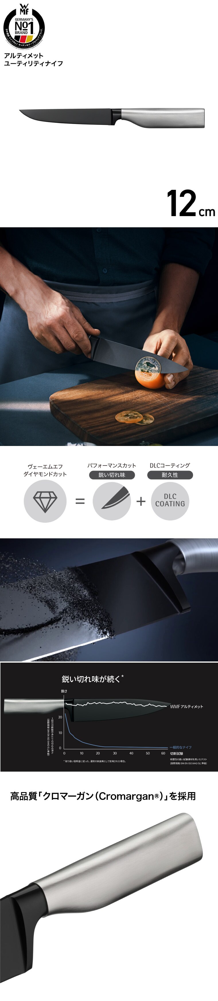 WMFが誇る最新精密技術(パフォーマンスカット)と高性能なダイヤモンドライクカーボンコーティング(DLCコーティング)との融合により、使い続けても摩耗しないナイフを実現。