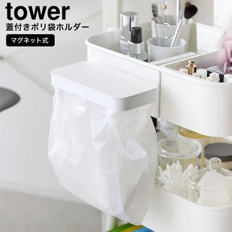 山崎実業 tower ワゴンに付けられるマグネット蓋付きポリ袋ホルダー タワー 公式 ゴミ箱 1701 1702 / ごみ箱 ダストボックス ふた付き レジ袋 冷蔵庫横 洗濯機 スチールワゴン / ホワイト