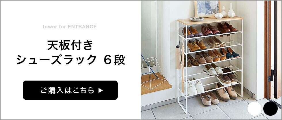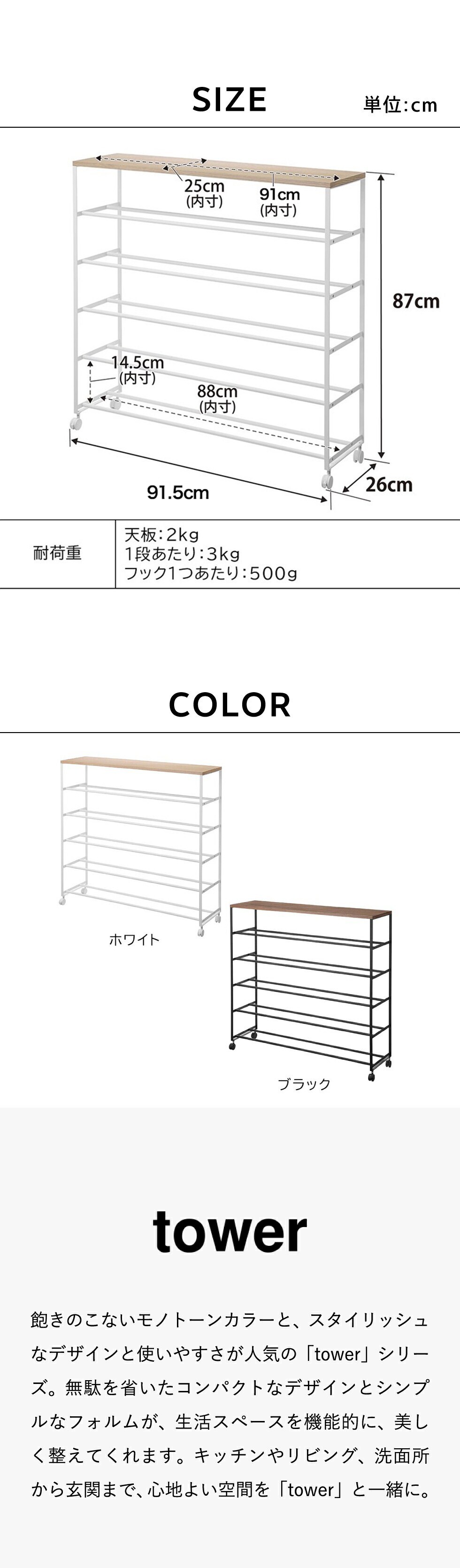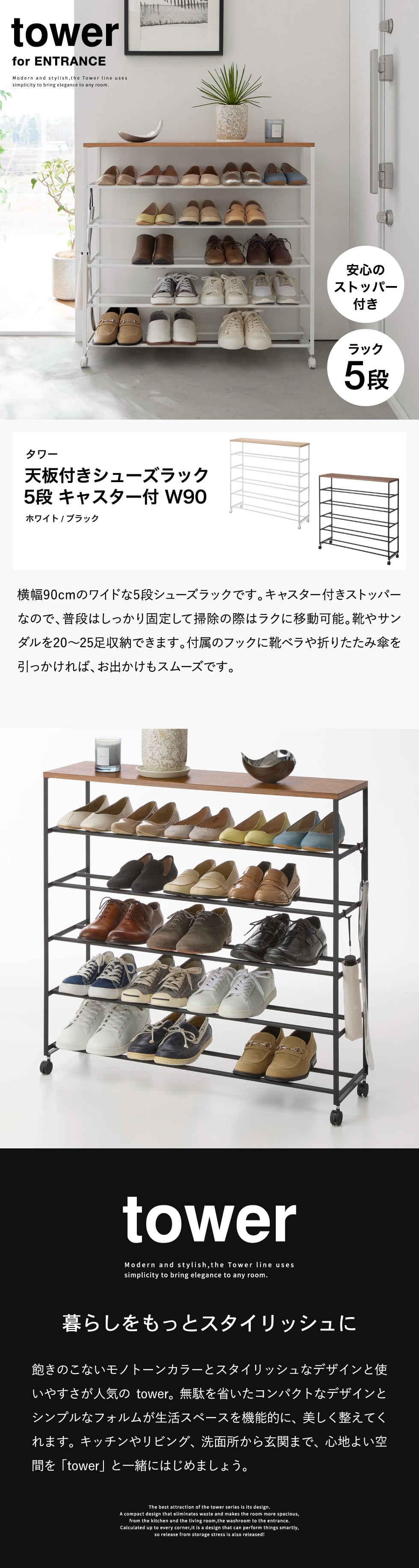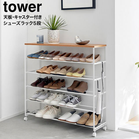 山崎実業 tower 天板付きシューズラック タワー 5段 キャスター付 W90 公式 1465 1466 送料無料 / 下駄箱 靴箱 靴棚 玄関収納 90cm ワイド 大容量 薄型 省スペース フック付き / ホワイト