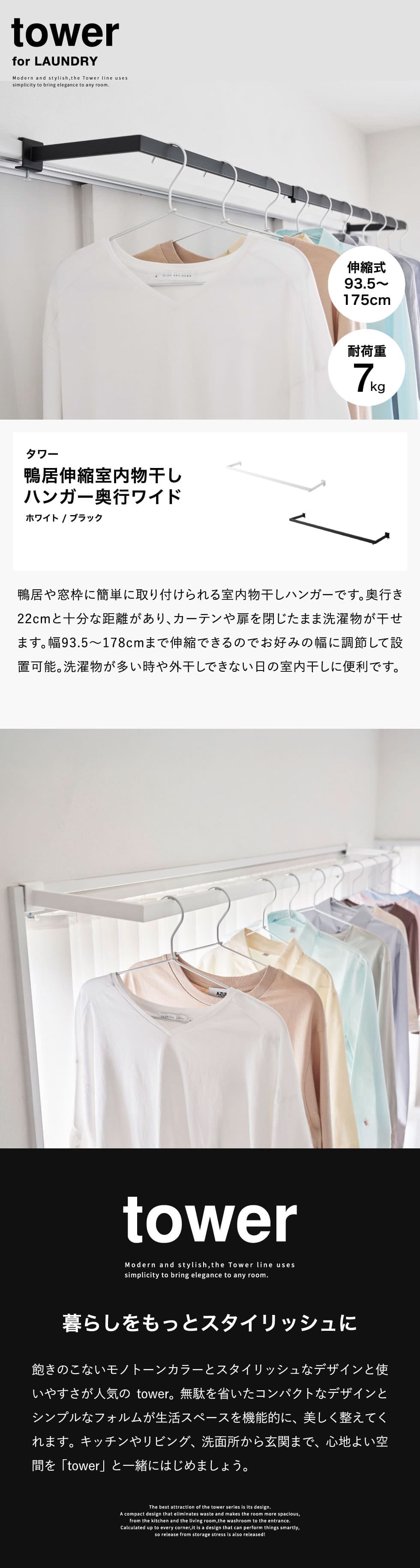 山崎実業 tower 鴨居伸縮室内物干しハンガー タワー 奥行ワイド 公式 1588 1589 送料無料 / 部屋干し 室内干し 物干し竿 ホルダー 窓枠用 取付 取り付け 洗濯物 梅雨 タワーシリーズ yamazaki JGS / ブラック