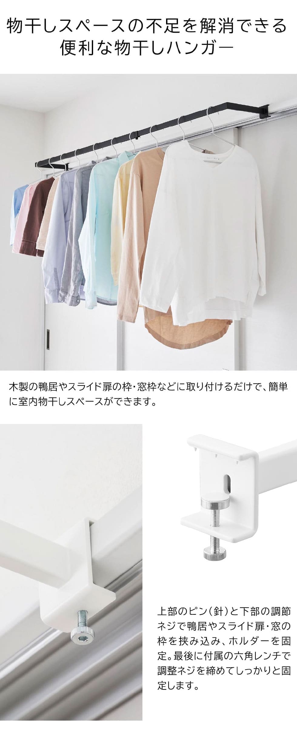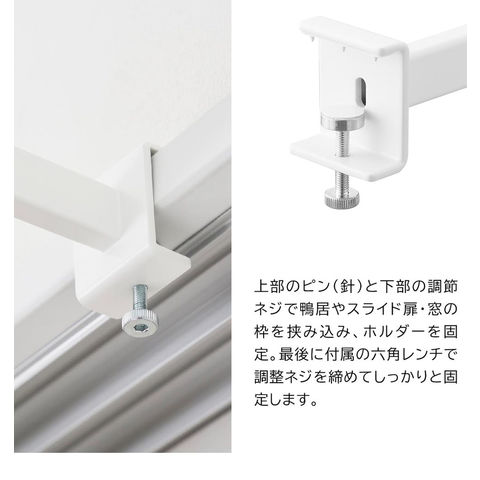 ■取り付け可能な場所 木製の鴨居・スライド扉の枠・窓枠・机・棚 枠の幅:99~180cm(本製品の幅) 枠の厚さ:1.5~3cm 枠上部の奥行き:1cm以上 枠下部の奥行き:1.5cm以上 |