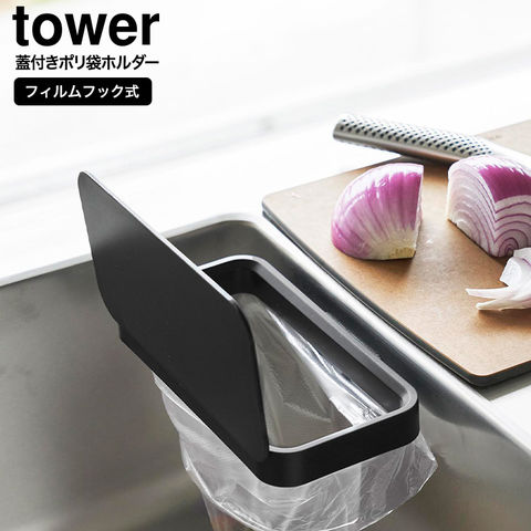 山崎実業 tower フィルムフック蓋付きポリ袋ホルダー タワー 公式 キッチン 1289 1290 / 三角コーナー ゴミ箱 シンク内 キッチンパネル タイル シンク扉 水切りネット yamazaki / ブラック