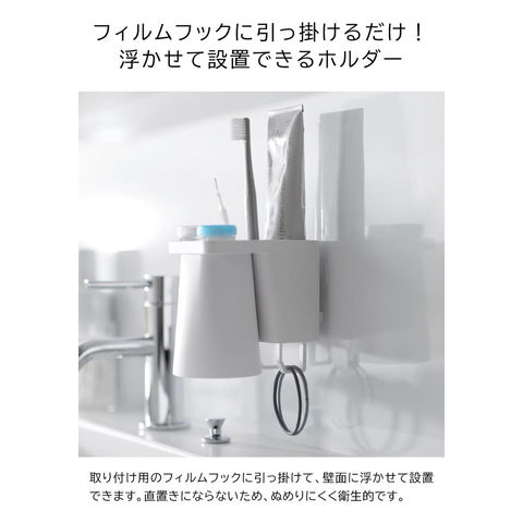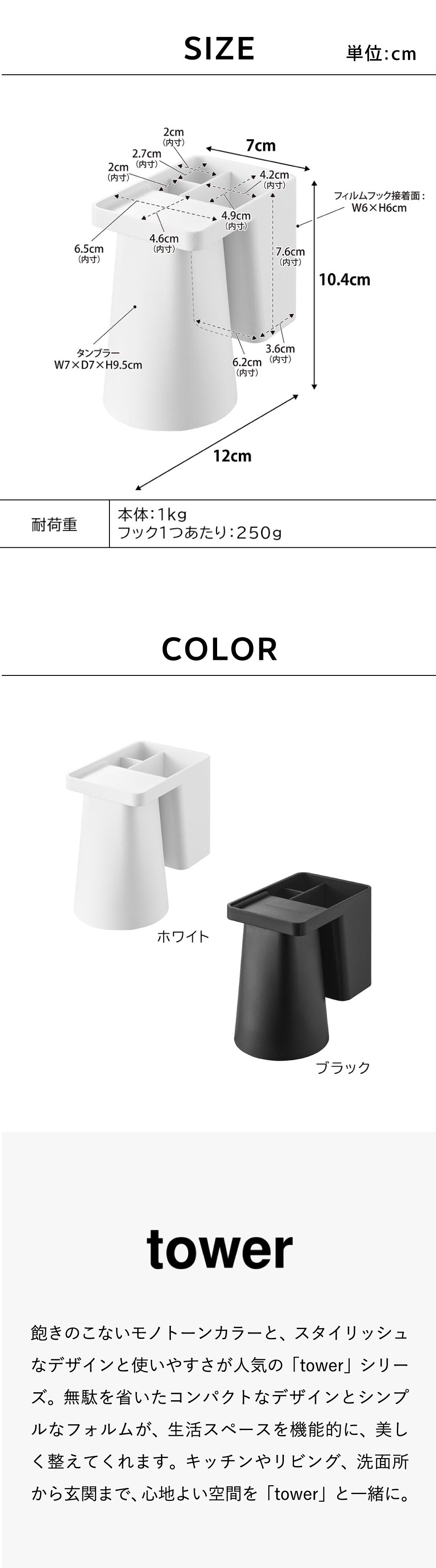 商品サイズ 本体:W7×D12×H10.4cm(タンブラー含む・フィルムフック含まず) タンブラー:W7×D7×H9.5cm フィルムフック接着面:W6×H6cm |