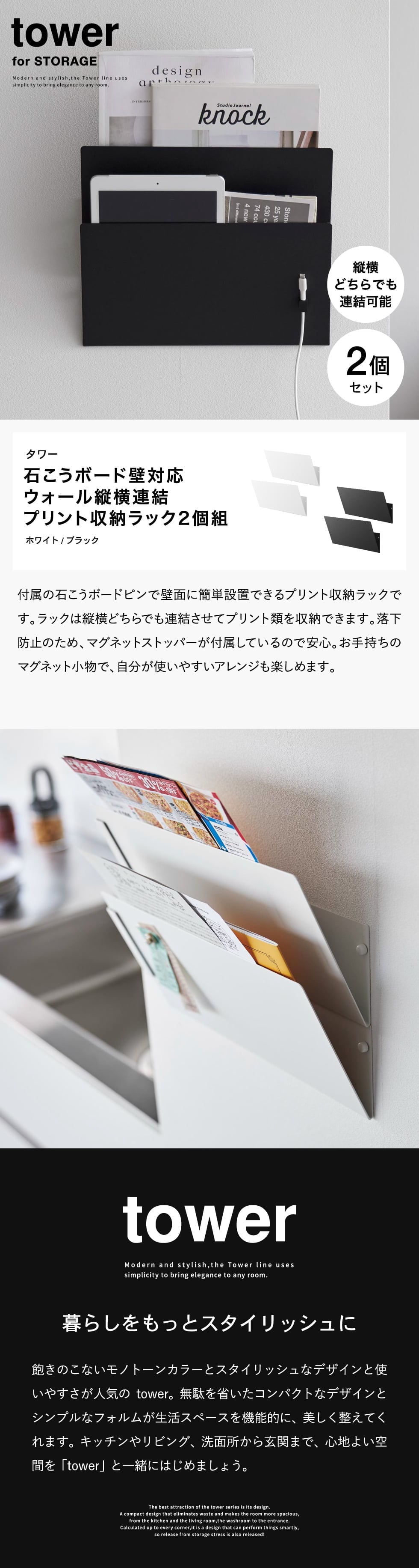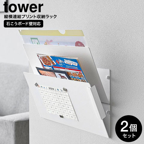 山崎実業 tower ウォール縦横連結プリント収納ラック タワー 石こうボード壁対応 2個組 公式 1343 1344 送料無料 / 書類 プリントケース マガジンラック タブレット スマホ 雑誌 リビング 壁面収納 / ホワイト