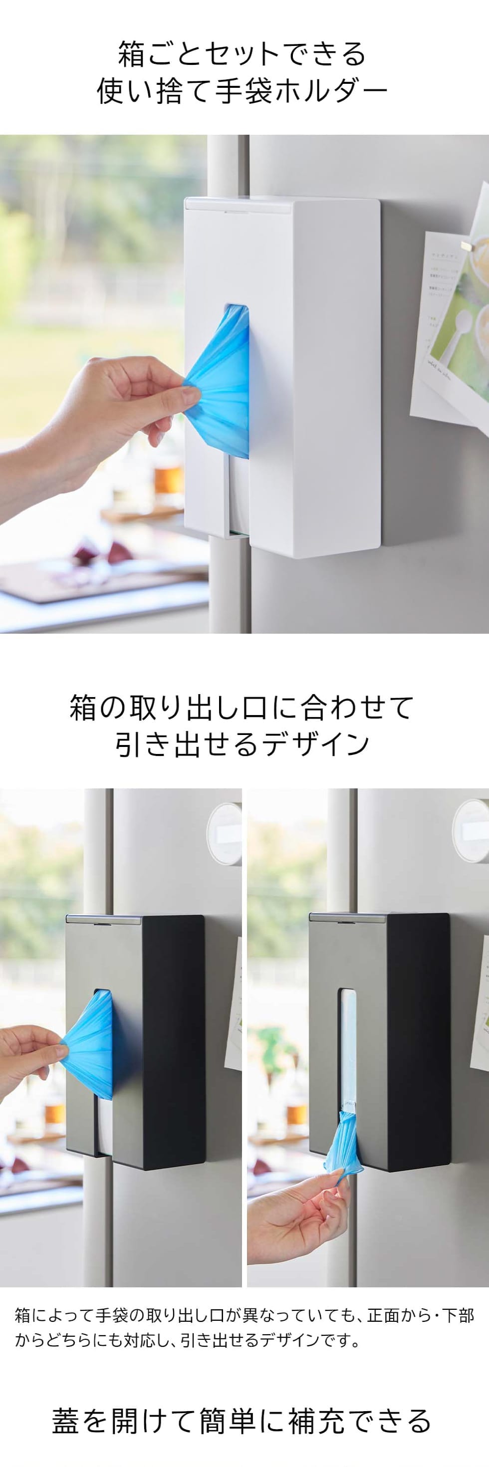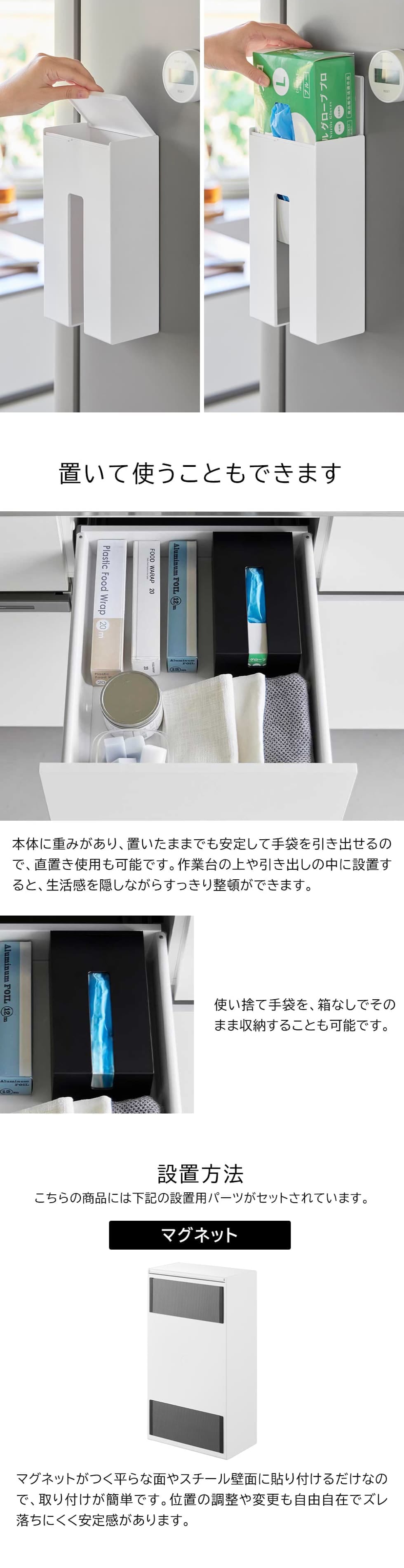 対応サイズ 幅23.5×奥行13.1×高さ6.8cmまでの箱入りの使い捨て手袋 ※形状やサイズによって、収納できない物もあります。 |