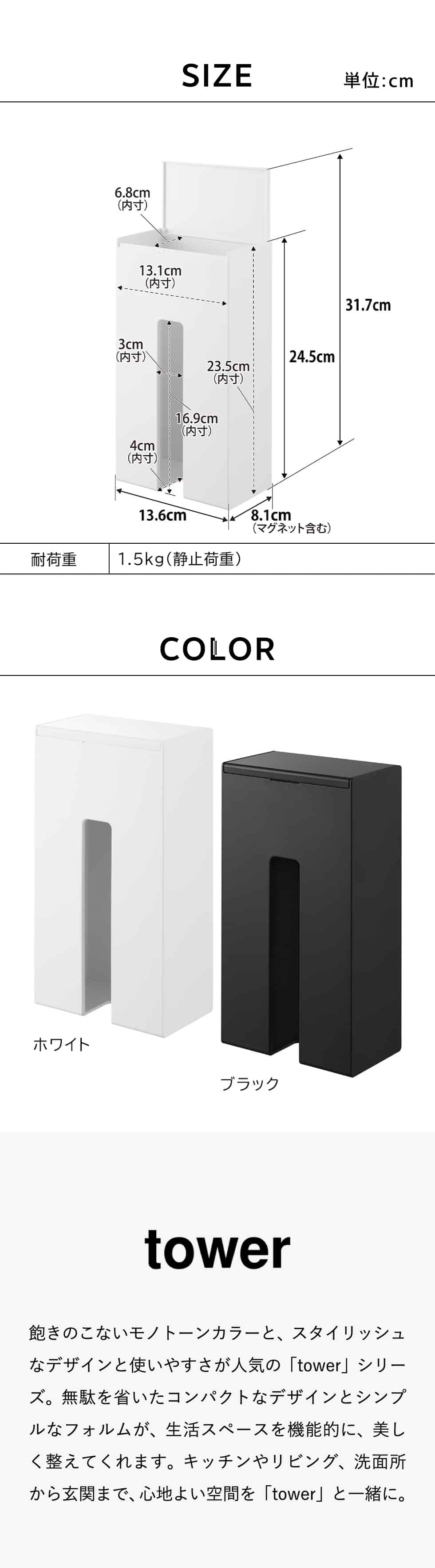 商品サイズ W13.6×D8.1×H24.5cm 蓋開口時:H31.7cm |