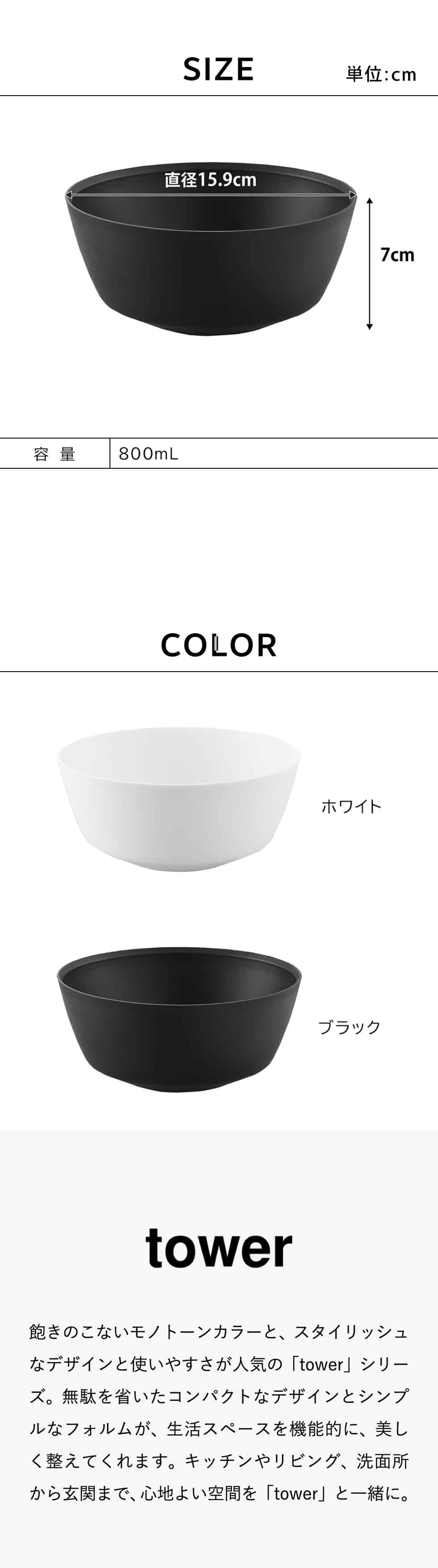 山崎実業 tower 傾けて混ぜやすい調理ボウル タワー S 電子レンジ対応 公式 1385 1386 / 800ml キッチンボウル ボール プラスチック 耐熱 耐冷 冷凍 食洗機 調理器具 キッチンツール JGS / ブラック