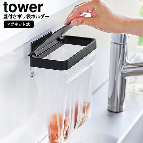 山崎実業 tower マグネット蓋付きポリ袋ホルダー タワー 公式 1919 1920 / 三角コーナー 生ごみ 生ゴミ入れ ゴミ箱 水切り袋 シンク内 キッチンパネル タイル シンク扉 / ブラック
