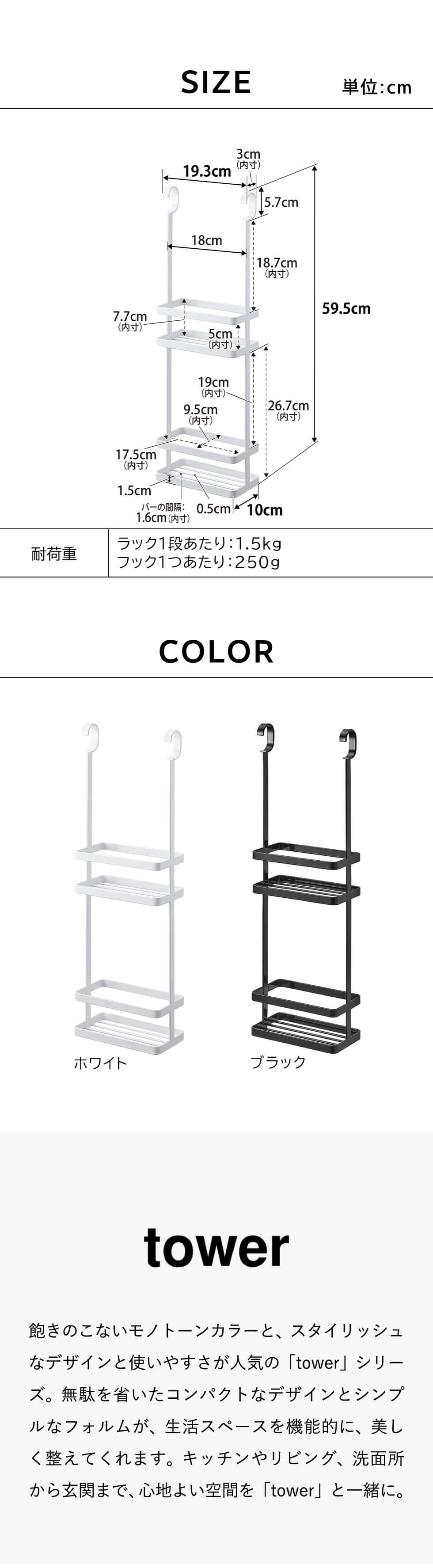 耐荷重 ラック1段あたり:1.5kg フック1つあたり:250g (静止荷重) |