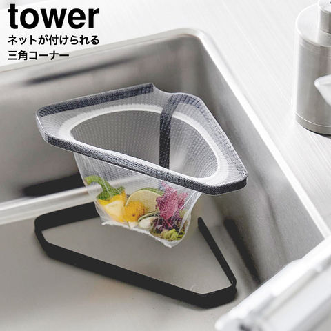 山崎実業 tower 水切りネットが付けられる三角コーナー タワー 公式 キッチン 1555 1556 / 水切りネットホルダー ポリ袋ホルダー 生ゴミ ゴミ入れ ゴミ箱 ステンレス フレーム 便利グッズ JGS dej / ブラック
