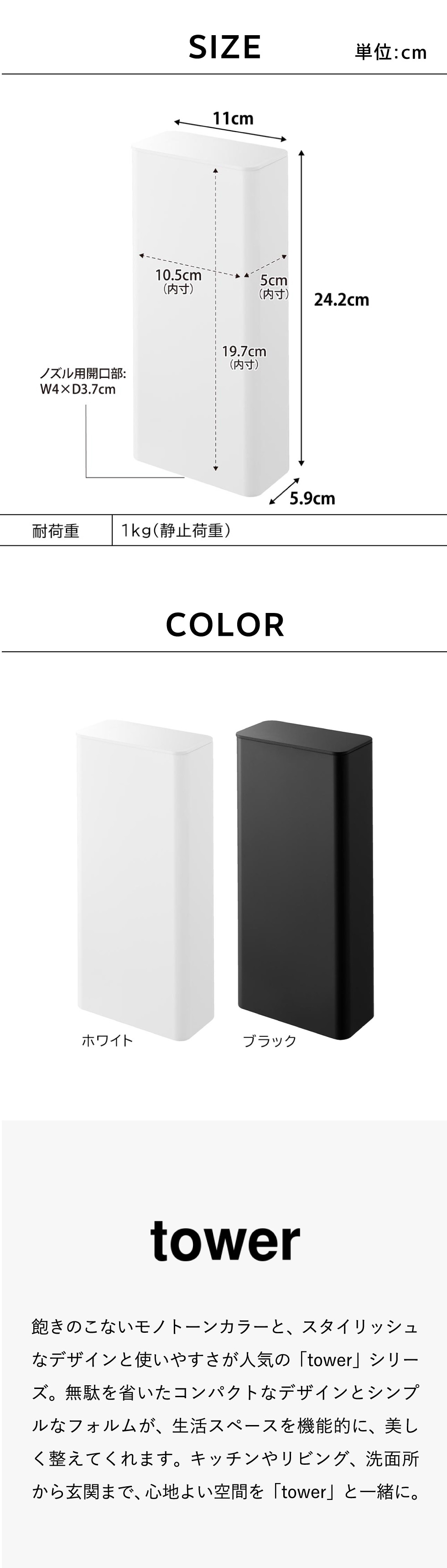 内寸サイズ 容器:W10.5×D5×H19.7cm ノズル用開口部:W4×D3.7cm |