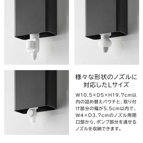 対応サイズ 詰め替えパウチ:幅10.5×奥行5×高さ19.7cm以内(内容量の目安:400mL) 詰め替えパウチ用ノズル:取り付け部分の幅が5.5cm以内で、ポンプ部分をノズル用開口部(幅4×奥行3.7cm)から通すことができるノズル ※サイズや形状によっては収納できない物もあります。 |