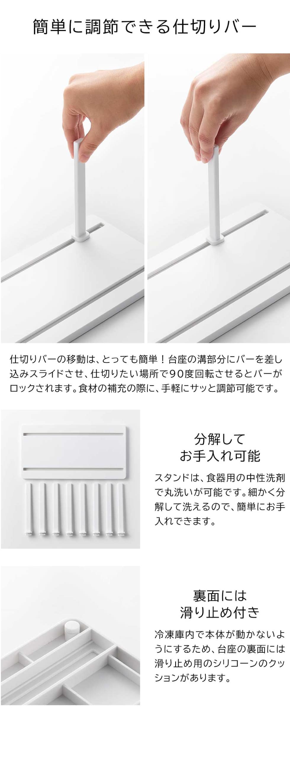 品質表示 本体・仕切りバー×8:ABS樹脂 滑り止め:シリコーンゴム |