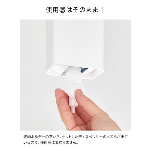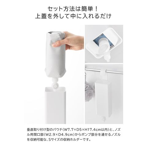 対応サイズ 詰め替えパウチ:幅7.7×奥行5×高さ17.4cm以内の垂直取り付けタイプ(内容量の目安:340mL) 詰め替えパウチ用ノズル:ポンプ部分をノズル用開口部(幅2.9×奥行4.9cm)から通すことができるノズル ※ノズルを斜めに取り付けるタイプの詰め替えパウチにはお使いいただけません。 ※サイズや形状によっては収納できない物もあります。 |