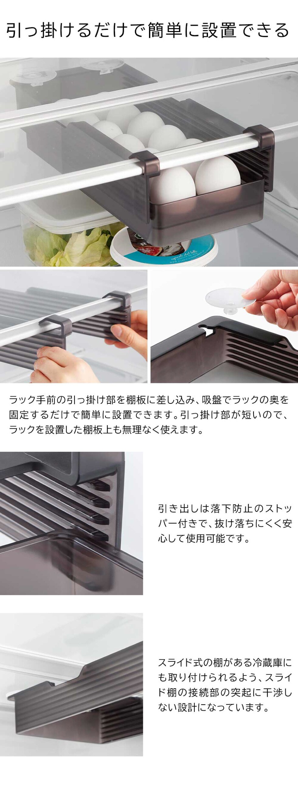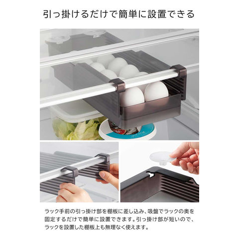 品質表示 ラック:ABS樹脂 引き出し・卵トレー:ポリスチレン 吸盤×2:エラストマー |