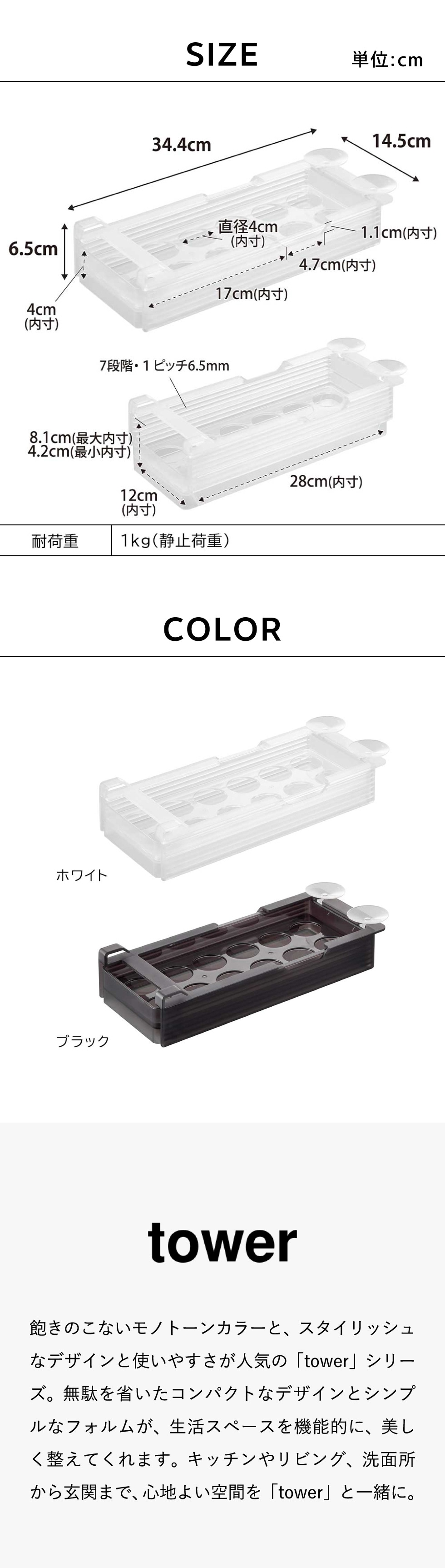 山崎実業 tower 冷蔵庫中棚下高さ調節卵ラック タワー S 公式 10108 10109 / 卵ケース 冷蔵庫内 収納ケース 収納ボックス 整理トレー 整理ケース 冷蔵庫収納 yamazaki / ブラック